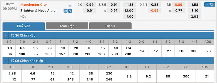 Tỷ lệ kèo giữa Manchester City vs Brighton