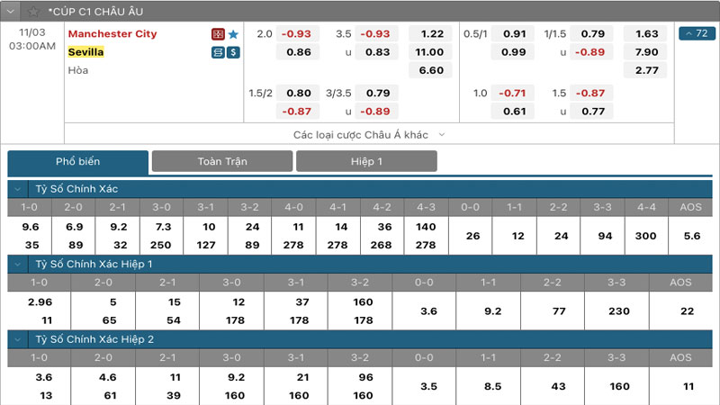 Tỷ lệ kèo giữa Manchester City vs Sevilla