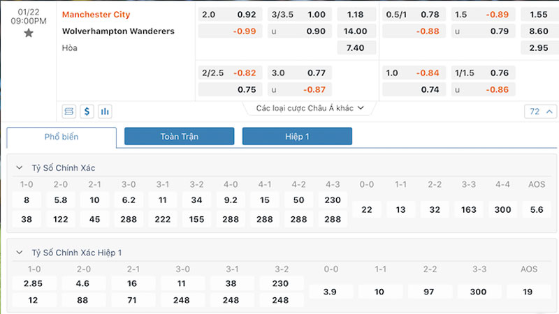 Tỷ lệ kèo giữa Manchester City vs Wolves