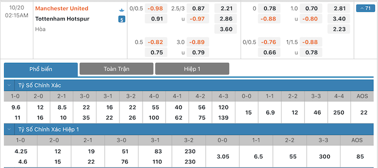 Tỷ lệ kèo giữa Manchester United vs Tottenham