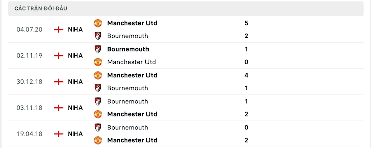 Lịch sử đối đầu của Manchester Utd vs Bournemouth