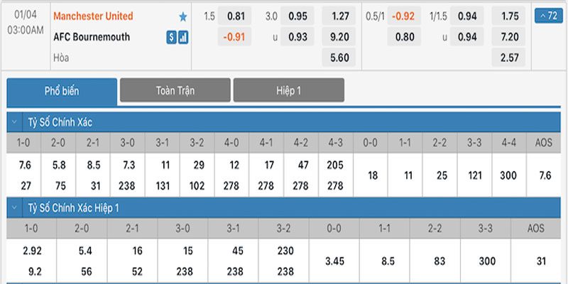 Tỷ lệ kèo giữa Manchester Utd vs Bournemouth