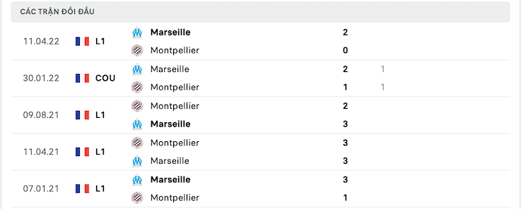 Lịch sử đối đầu của Montpellier vs Marseille