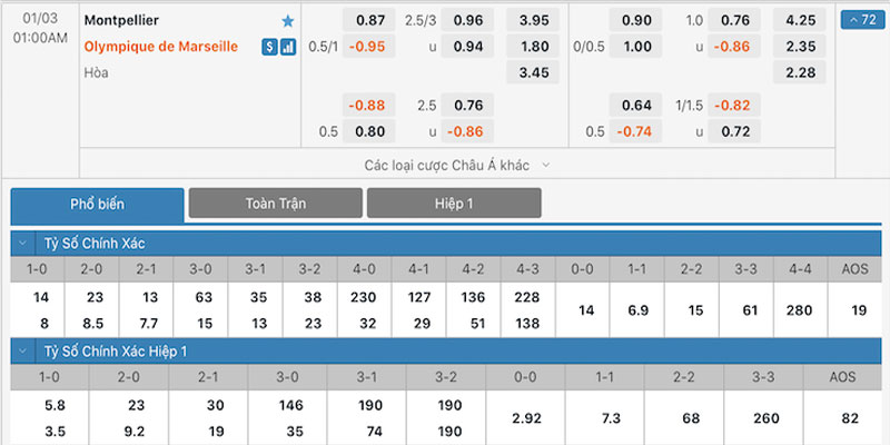 Tỷ lệ kèo giữa Montpellier vs Marseille