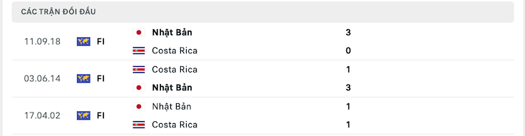 Lịch sử đối đầu của Nhật Bản vs Costa Rica