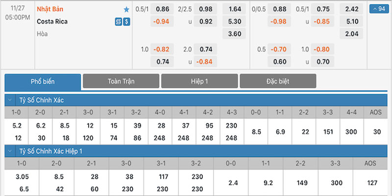 Tỷ lệ kèo giữa Nhật Bản vs Costa Rica
