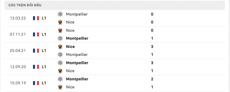 Lịch sử đối đầu của Nice vs Montpellier