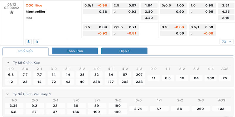 Tỷ lệ kèo giữa Nice vs Montpellier