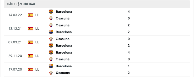 Lịch sử đối đầu của Osasuna vs Barcelona