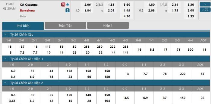 Tỷ lệ kèo giữa Osasuna vs Barcelona