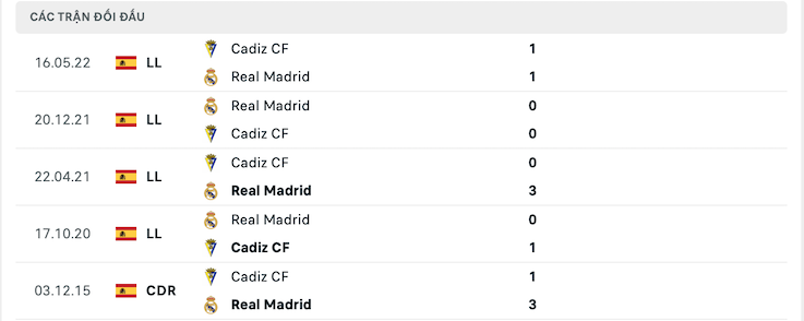 Lịch sử đối đầu của Real Madrid vs Cadiz