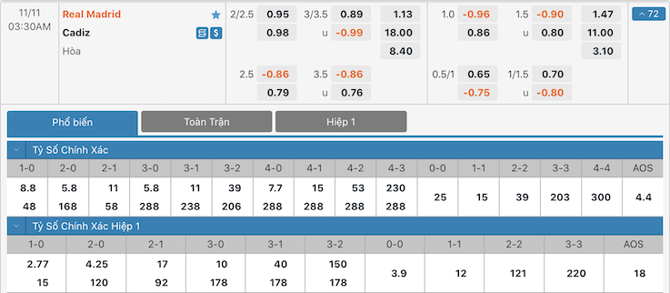 Tỷ lệ kèo giữa Real Madrid vs Cadiz