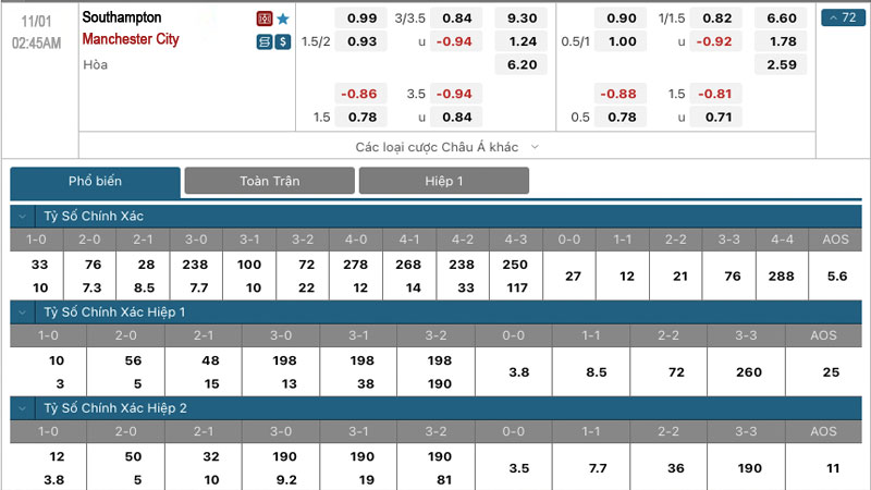 Tỷ lệ kèo giữa Southampton vs Manchester City