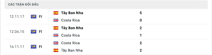 Lịch sử đối đầu của Tây Ban Nha vs Costa Rica