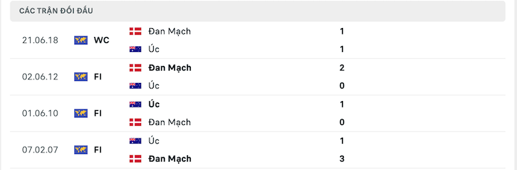 Lịch sử đối đầu của Úc vs Đan Mạch