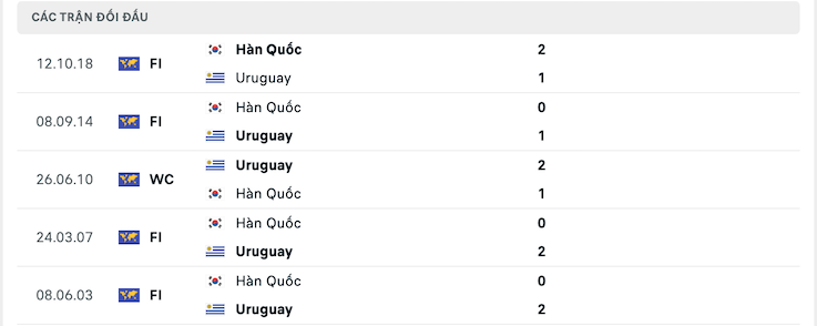 Lịch sử đối đầu của Uruguay vs Hàn Quốc