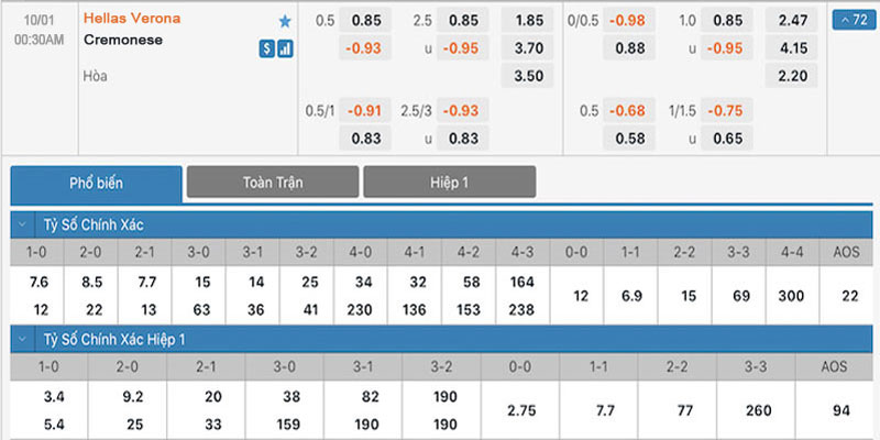 Tỷ lệ kèo giữa Verona vs Cremonese