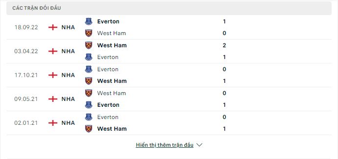 Là trận đấu giữa hai đội bóng đều đang vô cùng khát điểm, chắc chắn đây sẽ là màn chạm trán không khoan nhượng. Xét trong 5 lần đối đầu gần nhất giữa hai đội, West Ham đang chiếm ưu thế đôi chút khi thắng 3 so với con số 2 của Everton. Hai đội cùng có thành tích ghi bàn ngang bằng với 15 bàn thắng. Với lợi thế sân nhà của mình nếu đá đúng phong độ hiện tại West Ham vẫn dễ dàng có được 3 điểm như mong muốn.