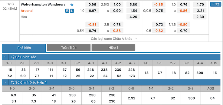 Tỷ lệ kèo giữa Wolves vs Arsenal