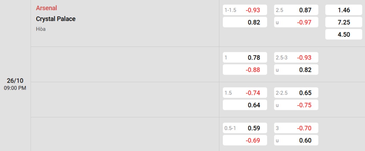 Arsenal chiếm ưu thế hoàn toàn ở kèo châu Âu. Ở 14 lần gần nhất tiếp đón Crystal Palace, đội bóng London thắng 8, hòa 5 và chỉ thua 1. Với phong độ hủy diệt hiện tại, khả năng Pháo thủ mất điểm là rất thấp. Trong khi đó, Palace tuy đang thi đấu kỷ luật nhưng lại thường sa sút ở những phút cuối, khi để hòa tới 8/14 trận gần nhất.