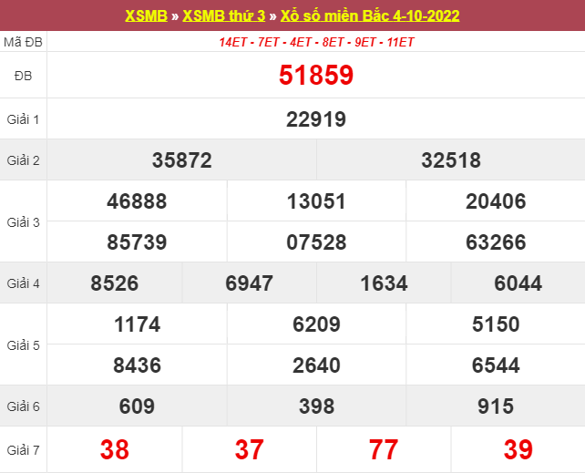 Kết quả xổ số ngày 04/10/2022