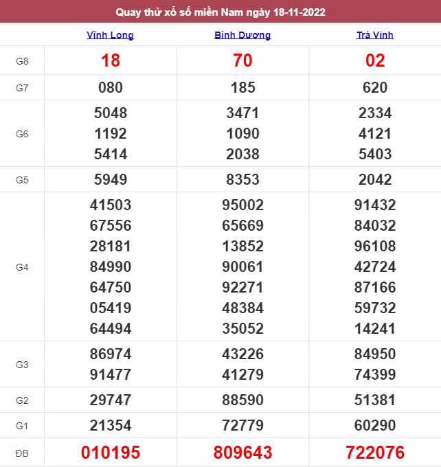 Các bài viết dự đoán XSMN của Zbet đã được kiểm nghiệm từ rất nhiều cao thủ và chuyên gia trong giới lô đề. Kết quả soi cầu XSMN 18/11/2022 có tỉ lệ chính xác lên đến gần 100%. Hy vọng những cặp số mà chúng tôi dự đoán sẽ giúp tất cả anh chị em gần xa trên mọi miền tổ quốc đại phát tài.