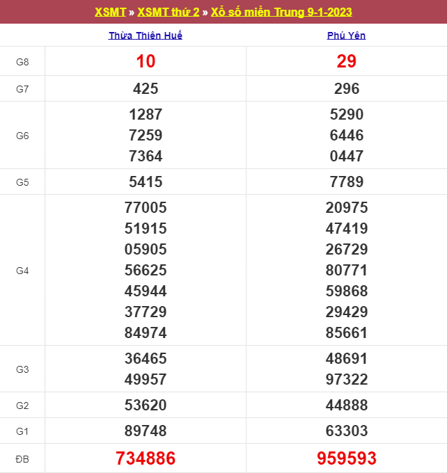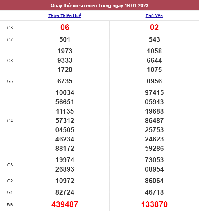 Giải đặc biệt đài Thừa Thiên Huế ngày 16/01/2023
